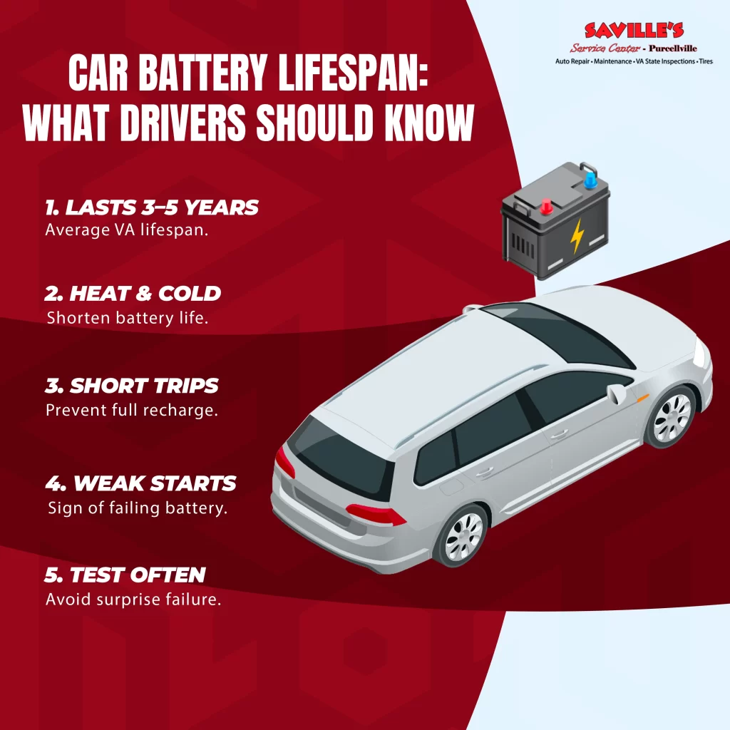 - Car batteries typically last between 3 and 5 years, with an average lifespan of about 4 years in Virginia.