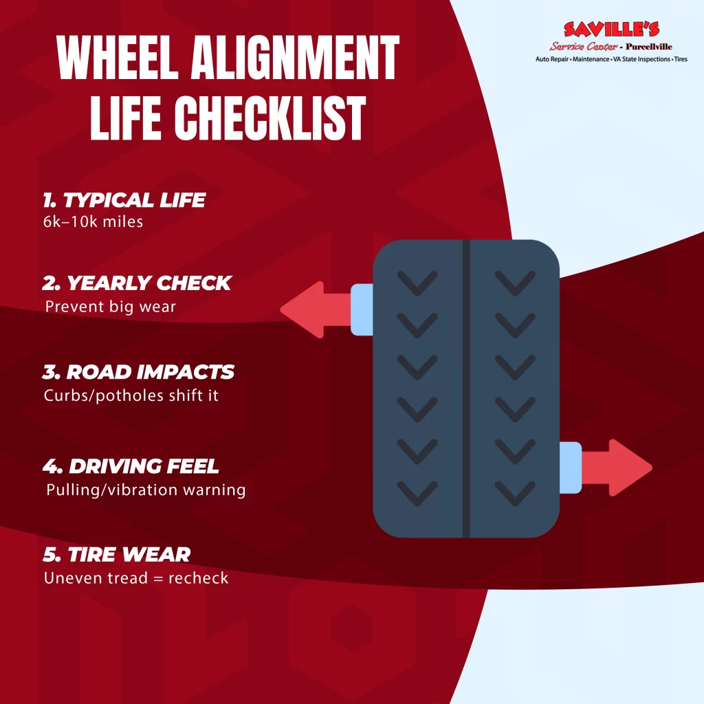 A wheel alignment usually lasts about 6,000 to 10,000 miles, but it can wear out faster if you hit potholes a lot, bump curbs, or drive on rough roads. If you need wheel alignment in Purcellville, VA, the easiest way to know it’s time is when you see uneven tire wear or notice steering pulls to one side, even on a straight road. Checking it once a year is a simple habit that helps your tires last longer and keeps your car driving straight.