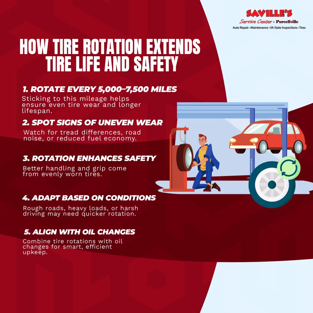 Tire rotation helps maintain even tread wear, which improves traction and stability. This consistency can enhance your vehicle’s fuel efficiency, as uneven tires can cause drag, making your engine work harder and consume more fuel.