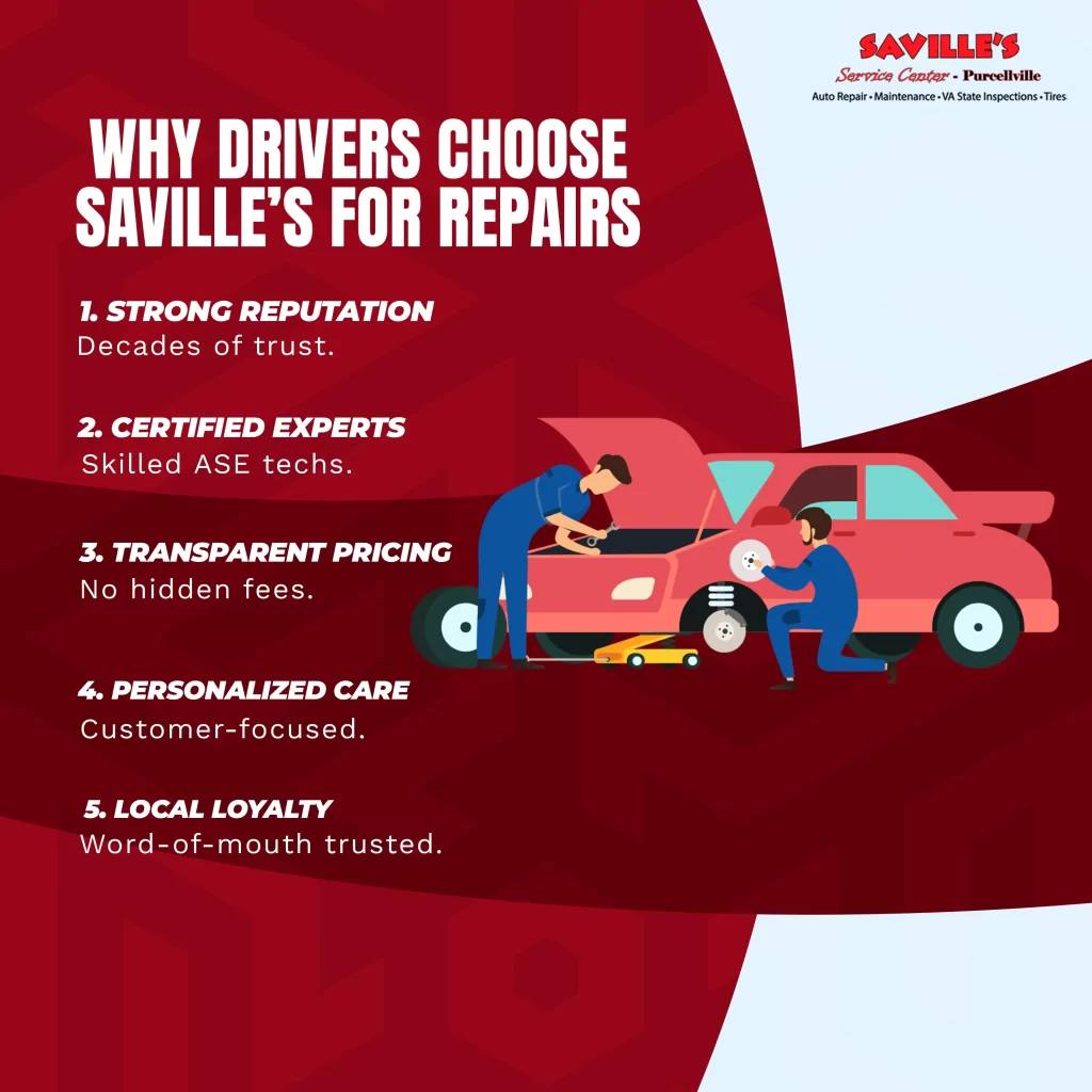 Saville’s Service Center stands out in Purcellville for its personalized service and hometown feel, which sets it apart from larger chain shops. Here, you’re not just another customer; you’re part of the community. This personalized auto service care includes: